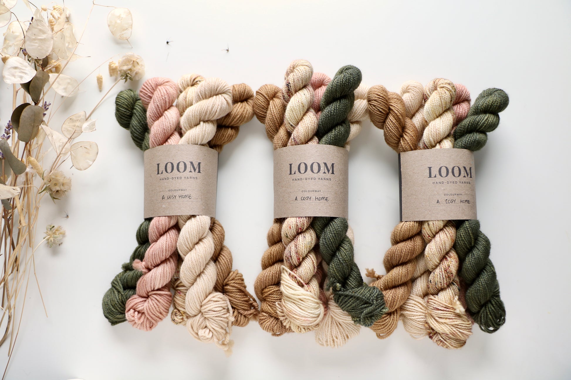A Cosy Home features a bouquet of minis in dusty pink, forest green, golden mustard and cream. Available in fingering weight and DK.