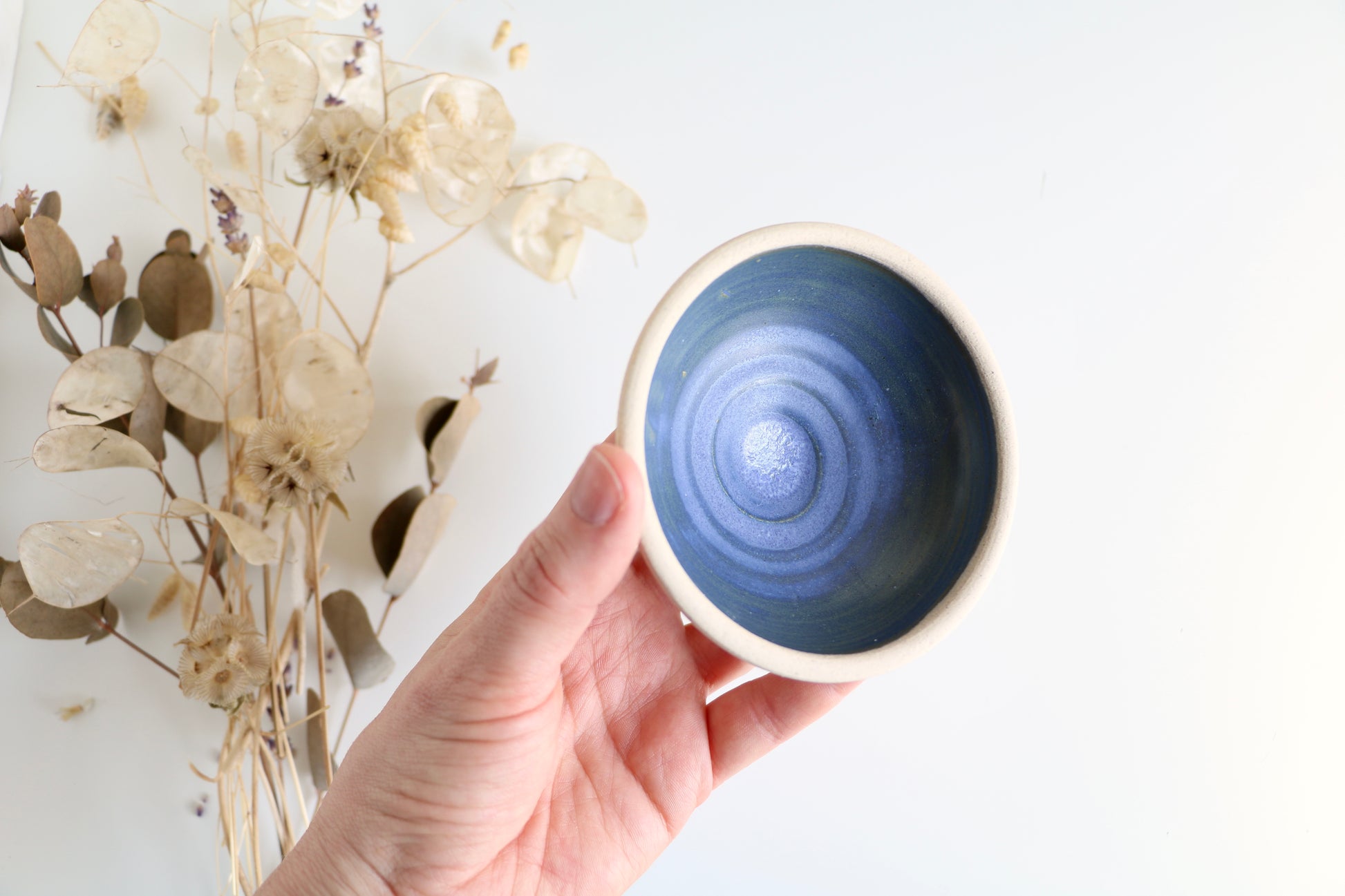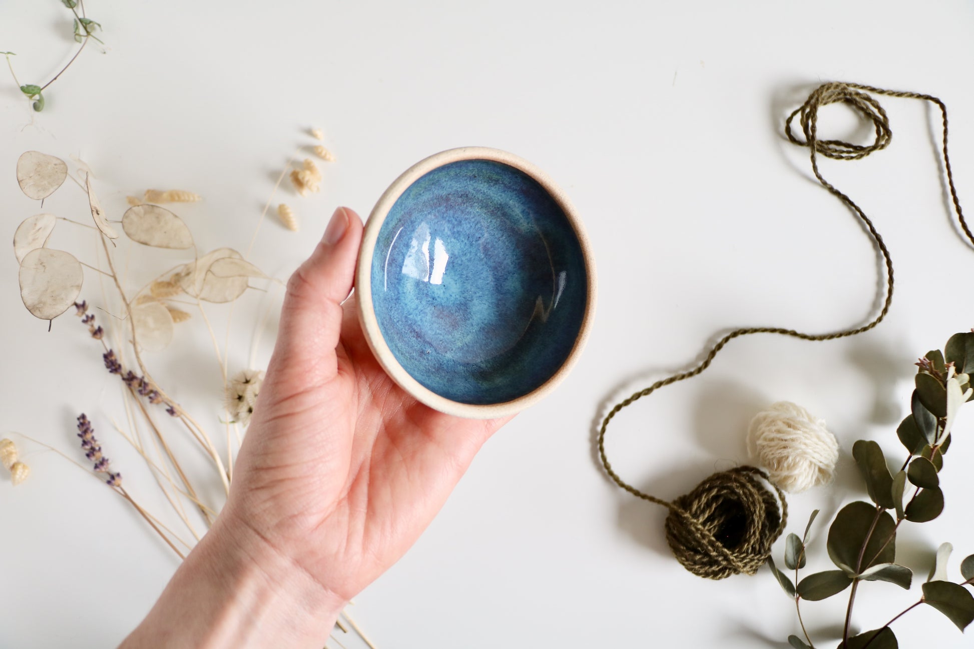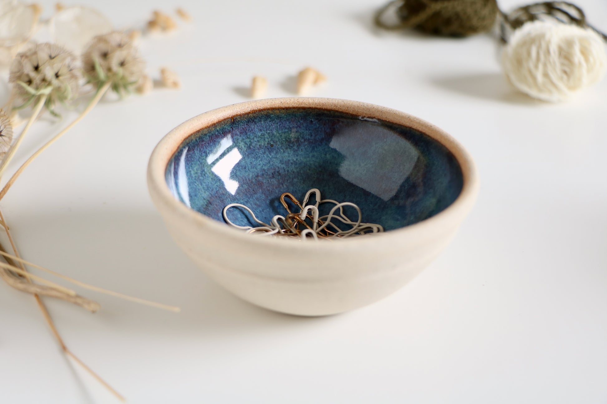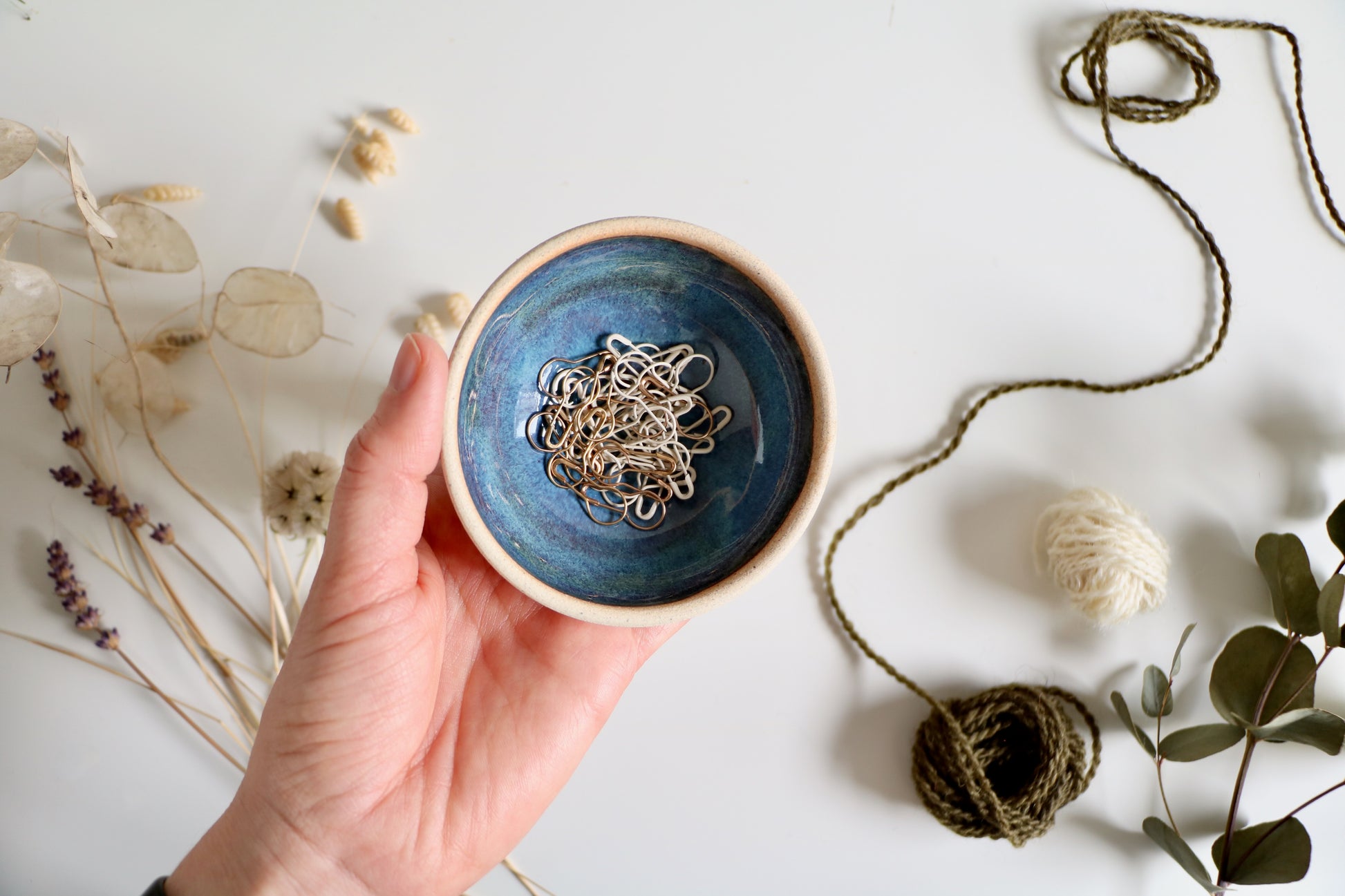 Made just for us by Pantyscallog Pottery in South Wales, these beautiful stoneware ceramic dishes are perfect for corralling your knitting notions. Glazed in an iridescent blue they're a useful, and beautiful, addition to your favourite crafting spot!