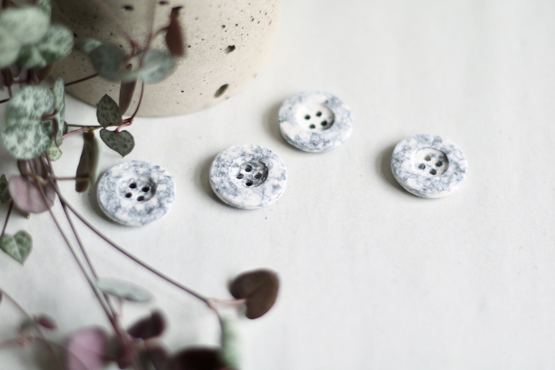Beautiful chalky, textured buttons. Made from 70-80% recycled cotton fibres and recycled resin they are dark with white speckles. Made in Italy, 18mm and 20mm button with 4 holes, sold individually.