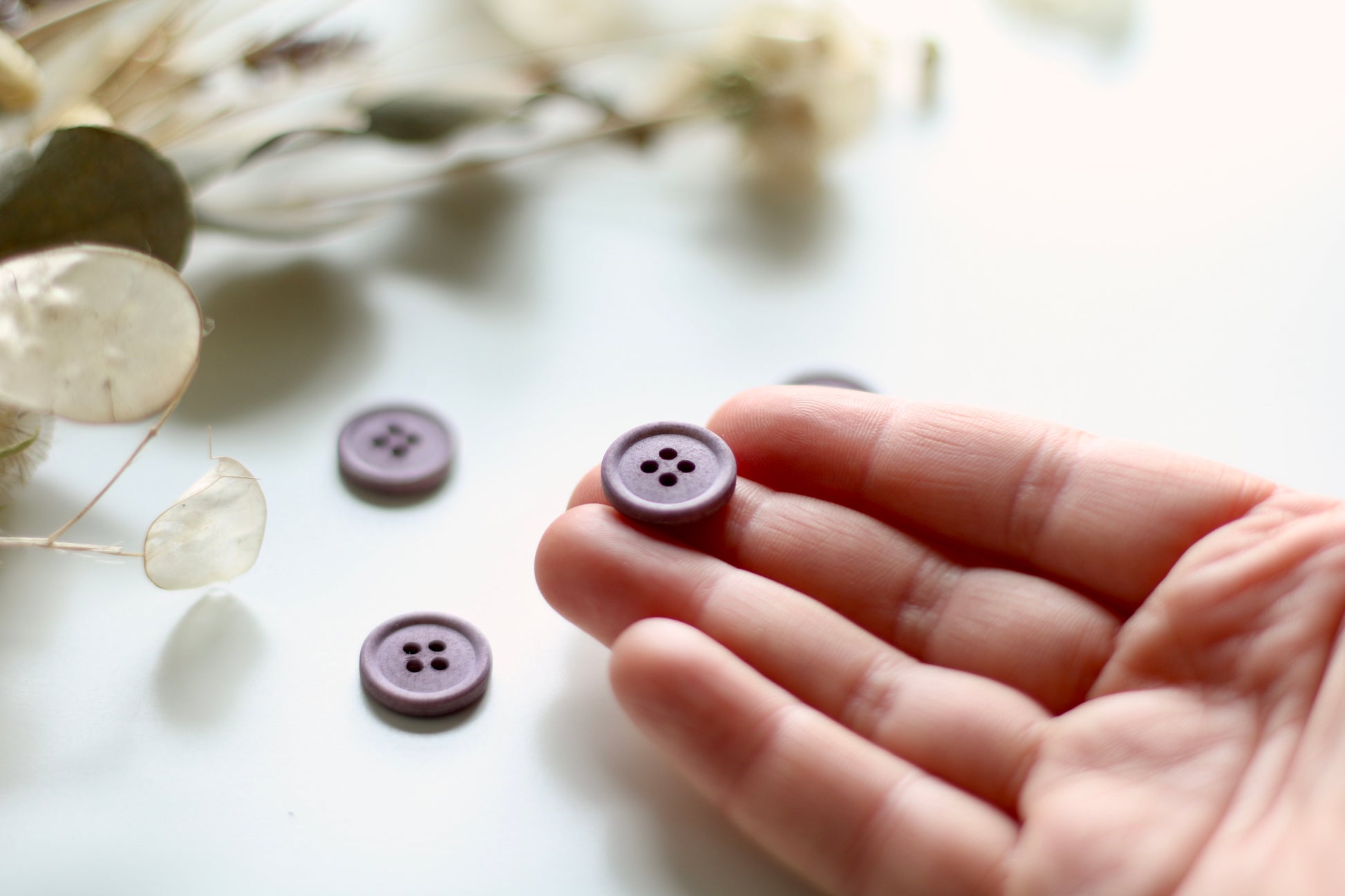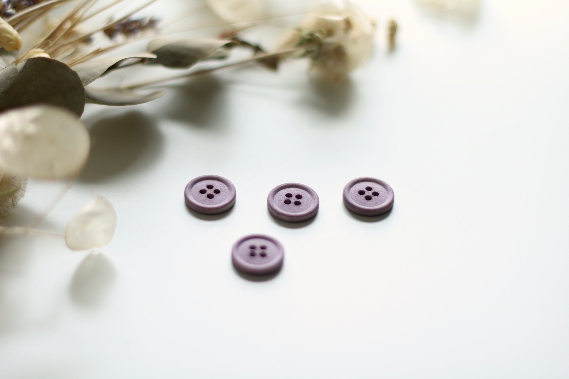 With a beautiful matte and chalky finish, these soft buttons are perfect for shirts and light to mid-weight knit cardigans in a beautiful dusty pinky purple shade. Fully washable, sold individually.