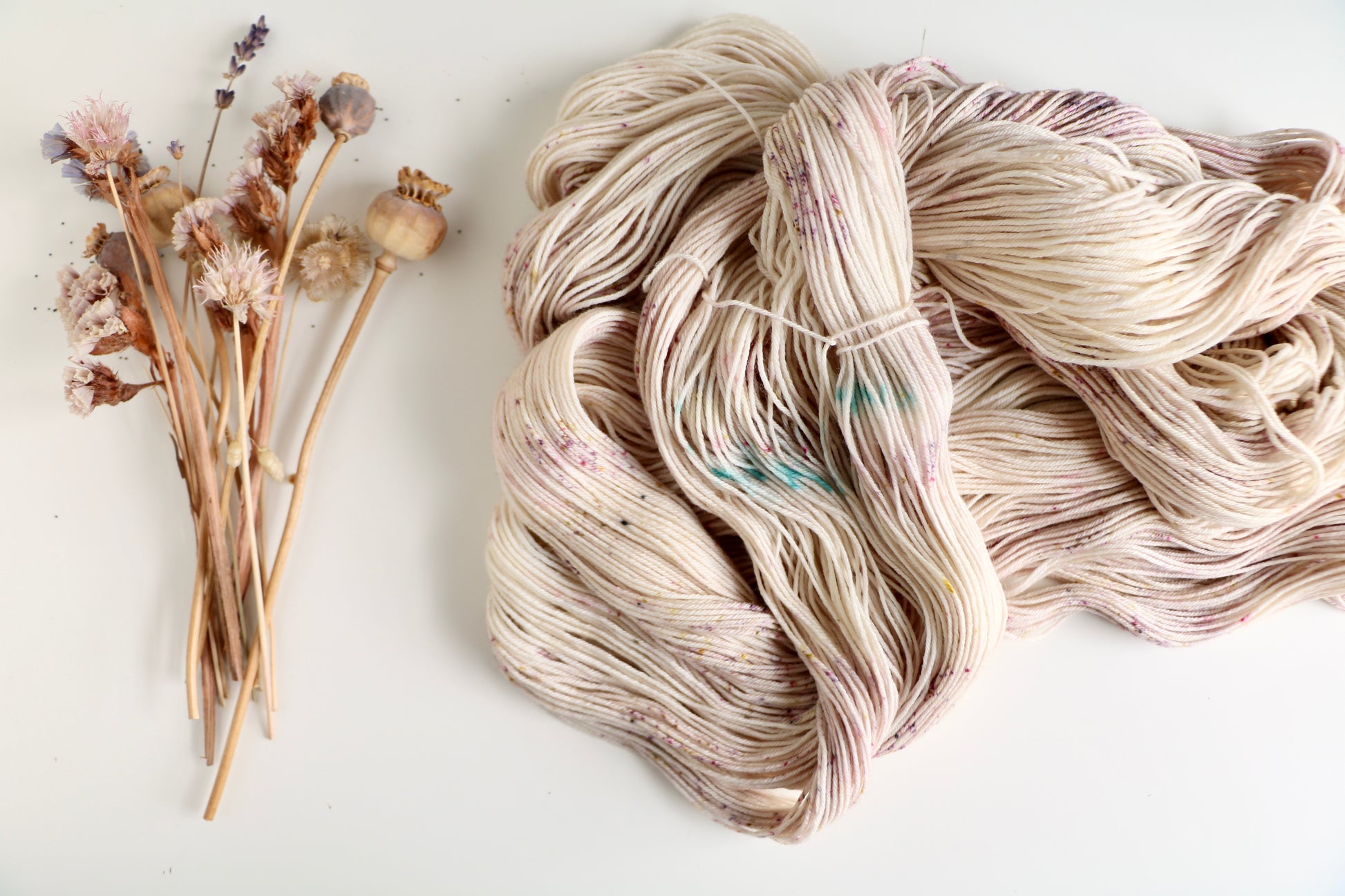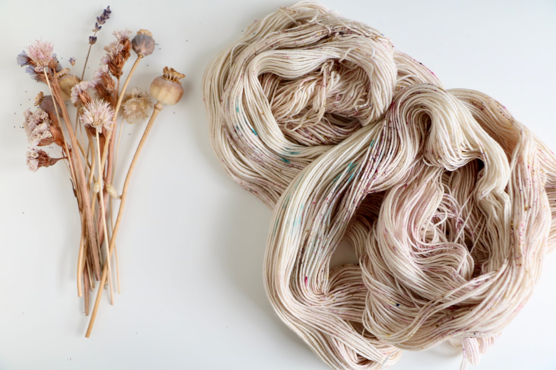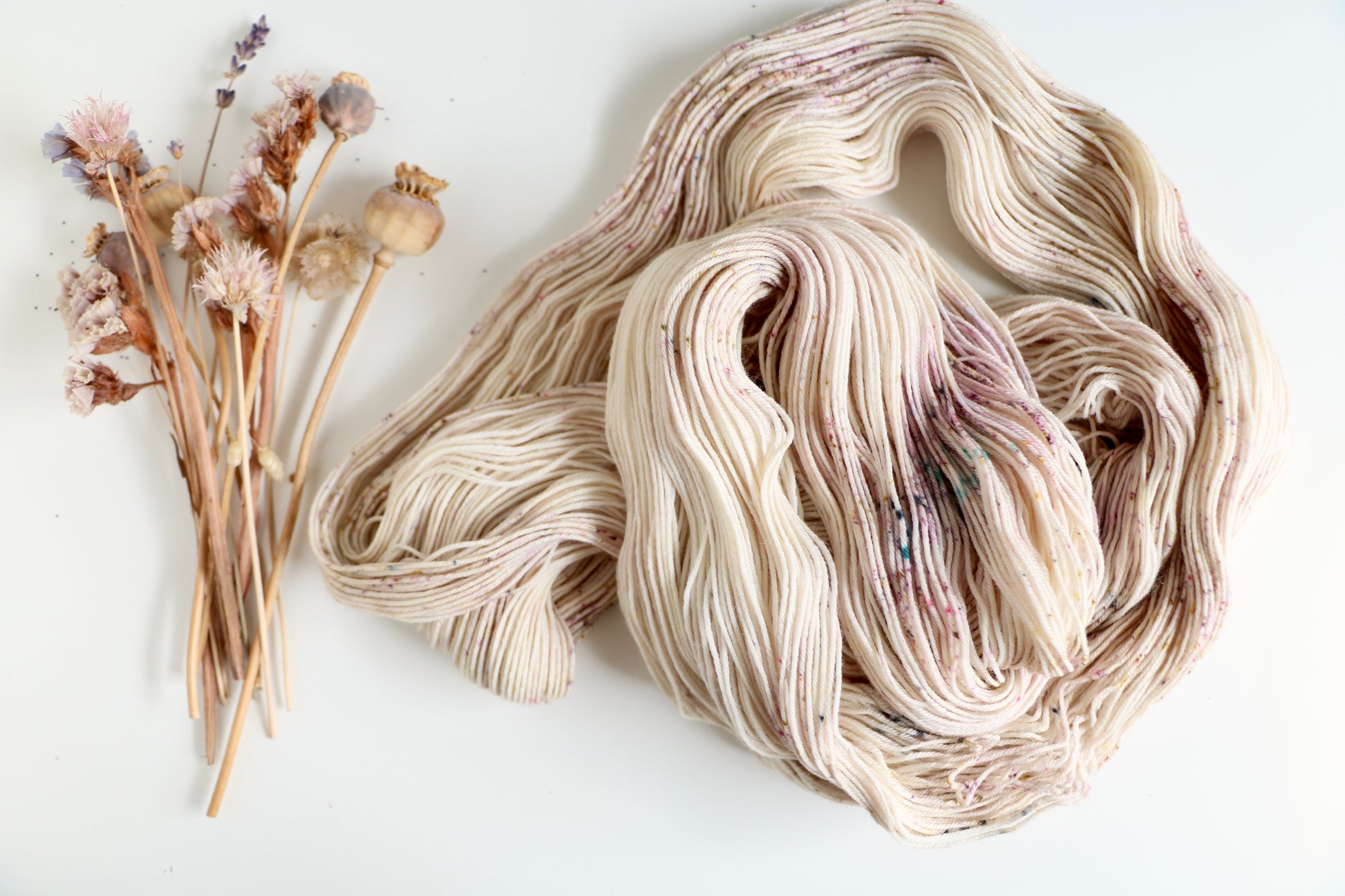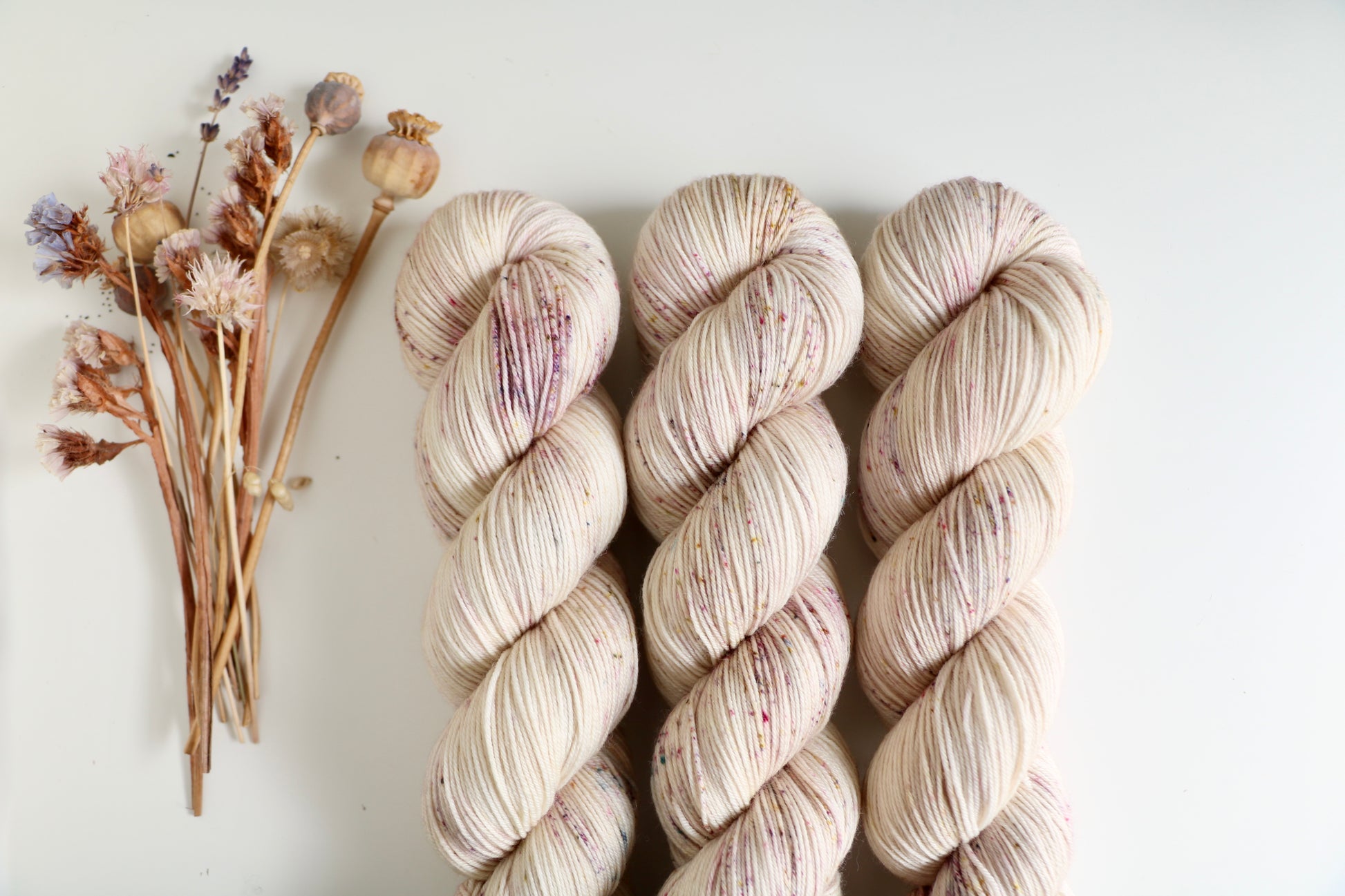 Evermore features delicate confetti speckles on a cream background. These three skeins have some tiny unintentional blue speckles, but are still beautiful.