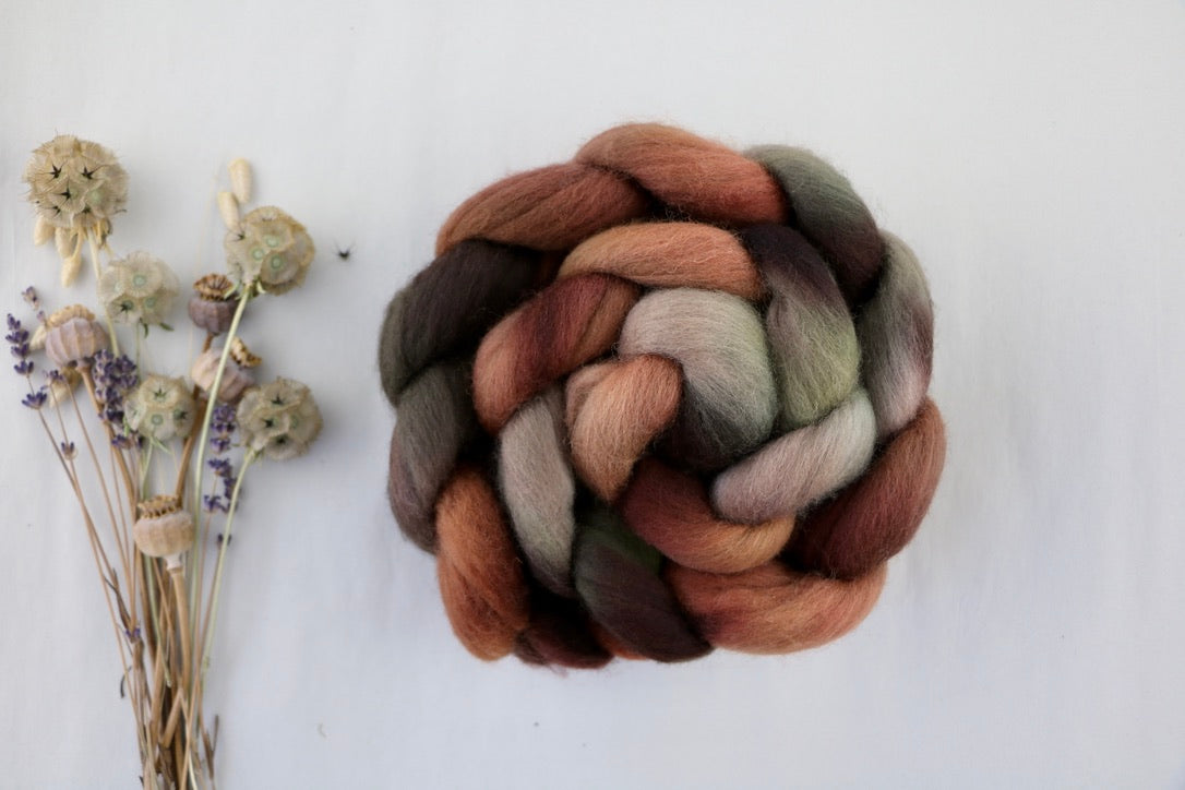 The Lost Wood is a blend of deep forest greens, golden amber and misty tones. This was the 2025 fibre advent full braid option.