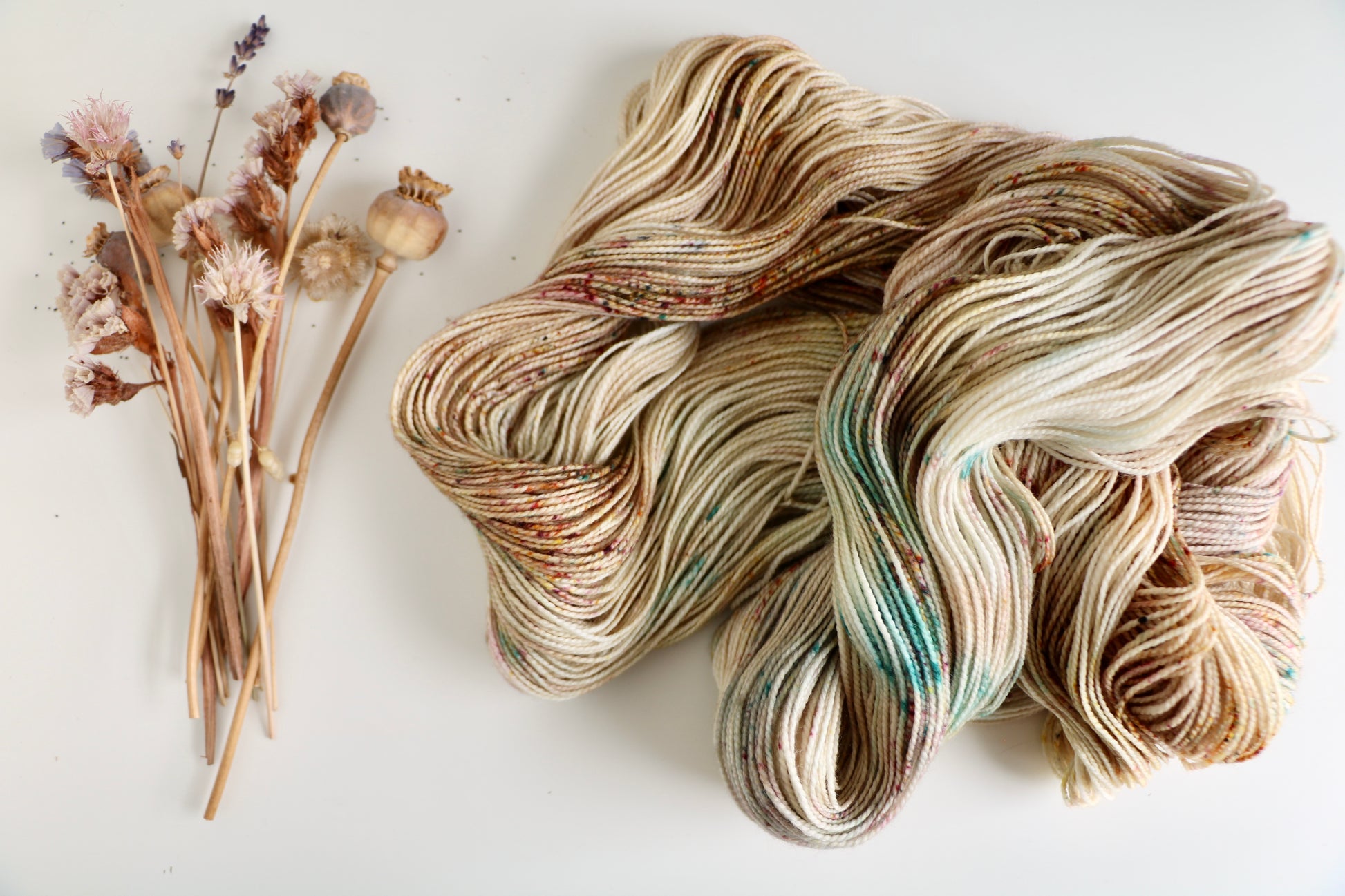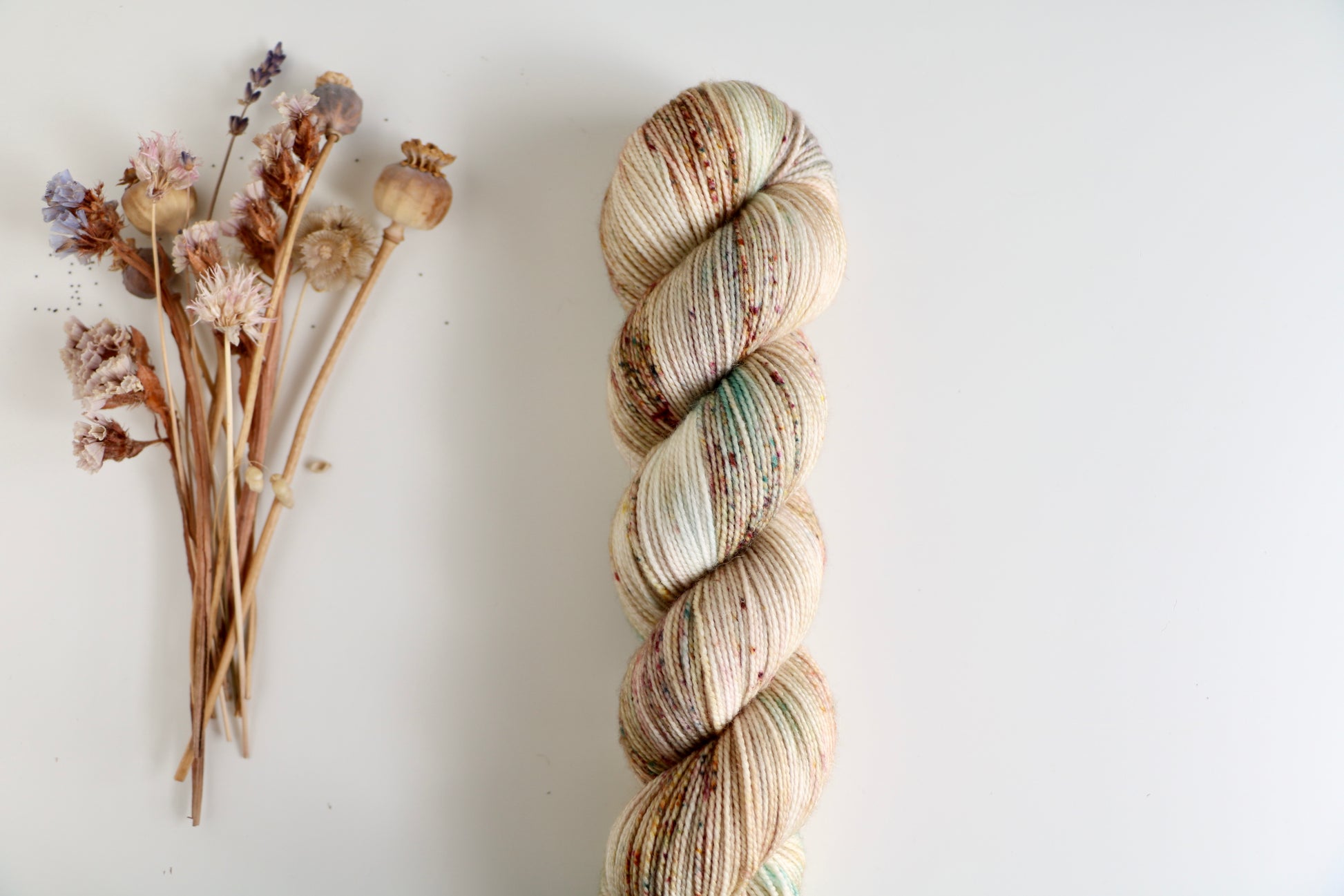 Wildflower features a warm medley of speckles on a cream background: burgundy brown, golden yellow, blue green. This skein has a larger than intended patch of blue, but is still beautiful.